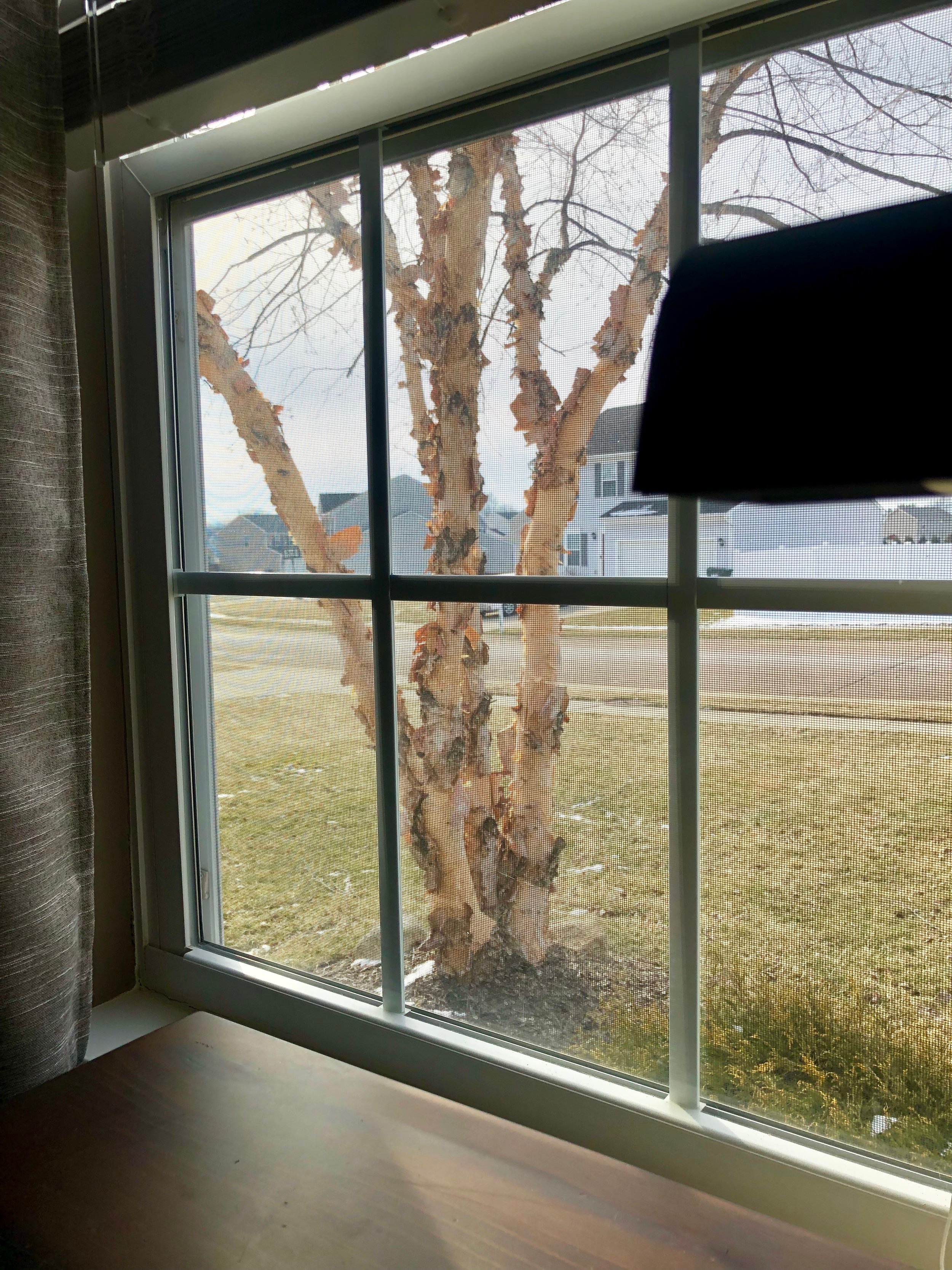 This is the view from my desk in our front room. It’s one of my favorite hangouts because of this striking River Birch tree that crowns the landscape and commands the gaze of passers by on the strength of the appeal of its shedded bark.